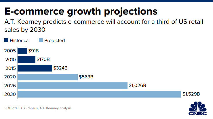 从那时起,电子商务的崛起推动零售商缩小了他们的实体店,更多的商品可以在网上购买。咨询公司A.T. Kearney的一项分析显示,电子商务销售额占美国零售总额的比例已从2010年的约6%增长至2019年的约12%。据预测,到2030年,这一比例将跃升至32%,即占美国零售总额的三分之一。