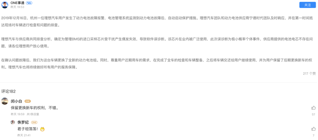 理想汽车还表示,该芯片在业内被广泛使用,此次误诊断为极小概率个体事件,供应商提供的电池电芯不存在问题,目前,已为故障车辆更换了全新的动力电池组,并向用户承诺保留后期更换新车的权利。