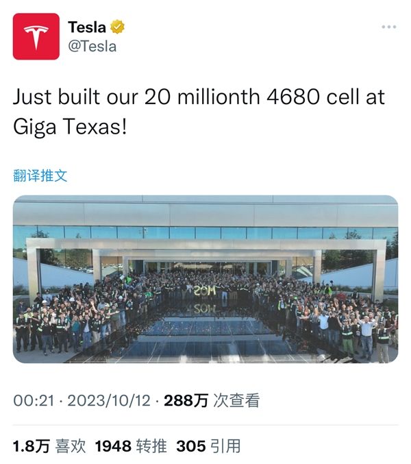 10月12日消息,特斯拉官方今日宣布,第2000万颗4680电池电芯已在美国得克萨斯州超级工厂下线,解锁新成就。