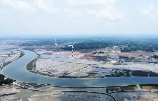 孟 加拉国科克斯巴扎尔风电项目位于该国东南部科克斯巴扎尔市城郊。项目总装机66兆瓦,共安装22台3兆瓦风力发电机,风电机组轮毂中心高度110米,叶轮 直径156米。2021年9月主体工程正式开工;2022年3月完成首台风机基础浇筑,7月升压站结构封顶,10月完成首台风机吊装;2023年10月 12日并网发电。