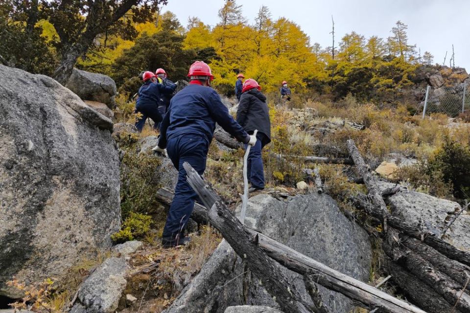 10月24日,在四川省甘孜藏族自治州稻城县香格里拉镇杜鹃山上,国网四川电力工人在海拔4002米的高度完成500千伏乡水一线131号塔消缺带电作业,这是目前国内海拔最高的超高压输电线路带电作业。