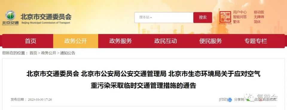 2023年10月30日,北京市交通委员会、北京市公安局公安交通管理局、北京市生态环境局发布了关于应对空气重污染采取临时交通管理措施的通告。