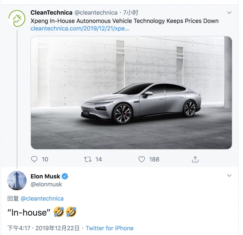 36氪获悉,事情围绕一则关于小鹏汽车的报道展开。12月22日,CleanTechnica发表题为“小鹏汽车自主研发自动驾驶技术让其维持低价”的文章,马斯克以揶揄口吻评论此文“自主研发”,并附上两个笑哭的表情。