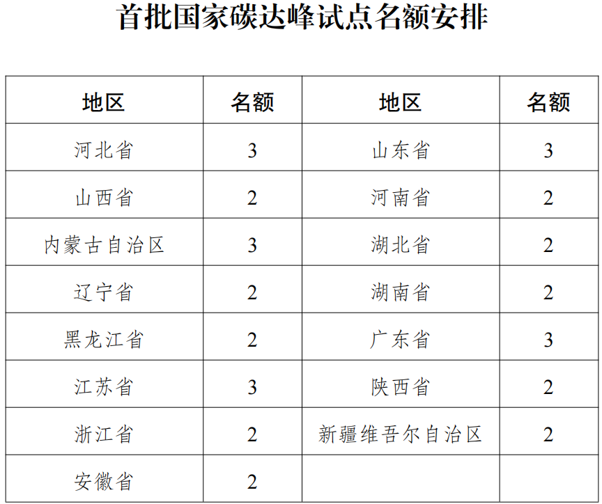 统筹考虑各地区碳排放总量及增长趋势、经济社会发展情况等因素,首批在15个省区开展碳达峰试点建设。试点城市建设主体原则上为地级及以上城市,试点园区建设主体为省级及以上园区。