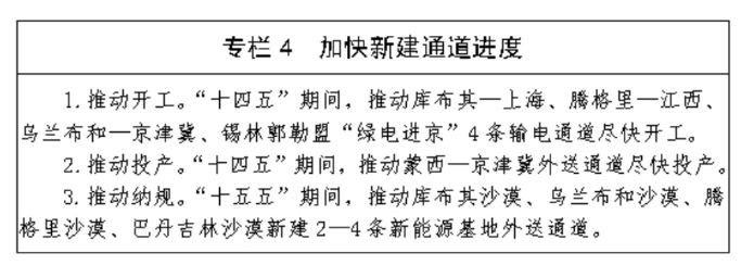 (四) 加速提升跨省跨区外送新能源规模。充分发挥自治区新能源资源优势和区位优势,按照谋划一批、投产一批、开工一批的发展思路,有序推动国家级新能源电力供应 保障基地及配套外送通道建设,助力全国碳达峰碳中和。加快推动已批复新能源外送基地投产运行,加快推动锡林郭勒盟“一交一直”,上海庙至山东、蒙西至天津 南交流特高压,扎鲁特至青州特高压输电通道配套新能源基地、乌兰察布风电基地等已批复新能源基地建设进度,大幅提高存量外送输电通道中新能源占比和通道利 用效率。积极谋划新建蒙西地区新能源外送通道,推动库布其—上海、腾格里—江西、乌兰布和—京津冀3条特高压外送通道尽早开工,蒙西—京津冀尽早建成投 产,继续推动锡林郭勒盟“绿电进京”或外送新能源基地及输电通道尽早纳规。“十五五”期间,在四大沙漠及周边地区新谋划2—4条外送通道。统筹自治区内风 光资源、用电负荷分布,积极推动区内跨盟市合作,谋划阿拉善盟至中东部盟市区内新能源自用基地、阿拉善盟与乌海市区域能源合作等项目及配套外送通道。
