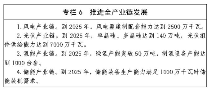 (七) 大力推动新能源装备制造全产业链发展。坚持调结构、转功能、提质量,因地制宜发展战略性新兴产业和先进制造业,推动相关产业迈向高端化、智能化、绿色化。 大力发展新能源装备制造业和运维服务业,壮大风光氢储四大产业集群。打造区域风电装备制造产业链,加快风电机组自主创新设计和上游供应链本地创新培育能力 建设,实施延链、补链工程,做大做强绿色智能风电装备制造,打造集设计、研发、制造、培训、服务为一体的风能产业体系,形成“风机制造—配套零部件—设备 运维—风电基地”产业链条。推动光伏产业链集群式发展,以硅材料先发优势为基础,推动光伏全产业链集群式发展,持续鼓励先进光伏晶硅材料技术的研发应用, 支持光伏晶硅材料向下游硅片、电池、组件方向拓展,形成具备一定规模化产能的区内硅料—硅棒—硅片—电池—组件产业链,形成以呼包鄂为中心的先进光伏产业 集群。加快发展氢能与燃料电池产业,依托丰富的新能源资源和氢能应用场景,统筹规划绿氢产业体系发展,加快引进一批掌握核心技术的新能源制氢、加氢、储氢 装备制造企业和燃料电池研发生产企业,在包头市、赤峰市、鄂尔多斯市、乌海市等盟市结合公共交通、物流、采矿等领域试点、示范、推广氢燃料电池汽车,构建 “制储运用研一体化”的氢能产业链。构建完整的新型储能产用研建设体系,依托锂离子电池正负极材料、石墨电极、隔膜等产业基础,引进以电化学储能、压缩空 气储能、飞轮储能、储热蓄能装备等先进装备制造业,培育发展配套产业,带动新型储能装备制造业发展。