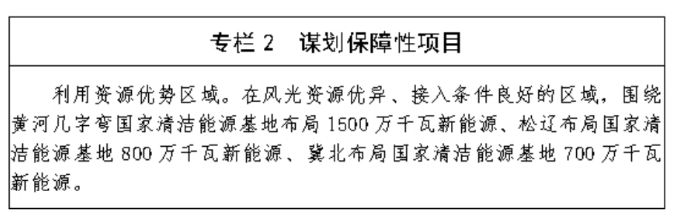 (二) 科学有序谋划保障性项目。以沙漠、戈壁、荒漠地区为重点,在库布其、乌兰布和、腾格里沙漠等地区,鄂尔多斯等采煤沉陷区,科尔沁和浑善达克沙地布局一批百 万千瓦级新能源基地,科学有序谋划新一批保障性新能源项目,到2025年谋划保障性新能源项目规模3000万千瓦以上。