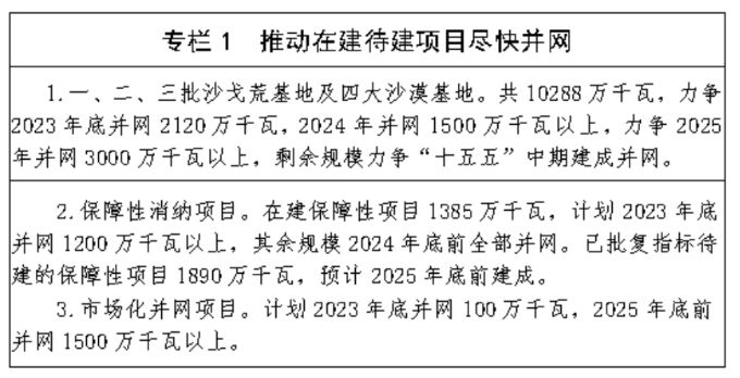 (一)推动待建在建项目尽早并网。 锚定新能源规模倍增目标,全面推进约2亿千瓦在建待建新能源尽早并网,重点包括国家百万千瓦级基地项目第一、二、三批5488万千瓦,乌兰布和、库布其、 腾格里沙漠等4个千万千瓦级大型风电光伏基地项目共4800万千瓦,保障性新能源项目3525万千瓦,市场化并网新能源项目4900万千瓦。精简规范各类 手续和流程,提升审批效率、缩短审批周期,统一土地性质认定,明确林草等不同地类用地标准,避免出现部门交叉认定、互为前置等问题。加强工作调度,协调解 决项目前期手续办理问题,推动新能源项目和接网工程同步纳规,加快在建待建新能源及配套工程建设速度。