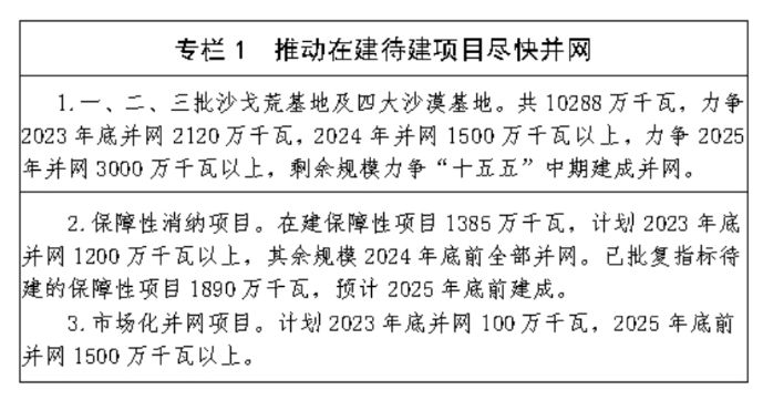 推动待建在建项目尽早并网。锚定新能源规模倍增目标,全面推进约2亿千瓦在建待建新能源尽早 并网,重点包括国家百万千瓦级基地项目第一、二、三批5488万千瓦,乌兰布和、库布其、腾格里沙漠等4个千万千瓦级大型风电光伏基地项目共4800万千 瓦,保障性新能源项目3525万千瓦,市场化并网新能源项目4900万千瓦。