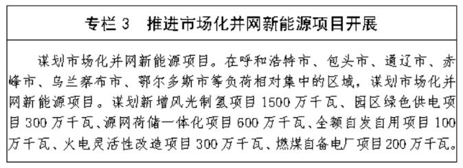 (三) 优先支持市场化项目开发。大力发展新能源制氢产业,充分利用自治区的氢能需求,增加绿氢应用场景,带动绿氢下游产业发展,扩大新能源消纳空间。进一步加大 风光制氢项目建设力度,到2025年全区绿氢生产能力突破50万吨,绿氢产能在全国占比超过50%,初步确立自治区绿氢生产全国领先地位。广泛拓展新能源 应用场景,优先支持源网荷储一体化、火电灵活性改造、风光制氢一体化、燃煤自备电厂可再生能源替代、工业园区绿色供电、全额自发自用6类市场化并网新能源 项目建设,并积极探索新的市场化项目应用场景开发模式。到2025年,谋划市场化并网新能源项目容量3000万千瓦。加快零碳、低碳工业园区试点建设,依 托自治区已批复的鄂尔多斯蒙苏经济开发区、包头市达茂旗巴音花园区2个零碳示范园区,阿拉善高新技术产业园、鄂托克经济开发区、霍林郭勒高新技术产业开发 区、包头铝业产业园区等4个低碳园区试点,探索“绿色供电+低碳经济”的协同发展模式,统筹考虑新能源布局,按照总体规划、一次批复、分批实施的原则进行 新能源配置,推进园区整体高端化、智能化、绿色化发展,提高新能源消纳比例,实现工业绿色转型发展。