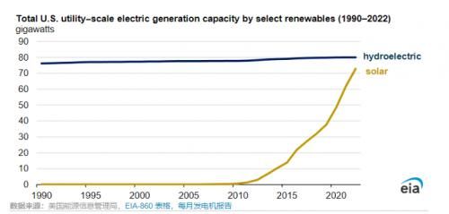 投资税收抵免等激励措施鼓励了可再生能源发电能力的增长。截至2023年8月,美国太阳能装机容量总计超过125吉瓦(GW),其中包括80吉瓦的公用事业规模太阳能容量和估计45吉瓦的小型太阳能容量。过去几十年来,美国的水力发电容量相对稳定地保持在80吉瓦左右。
