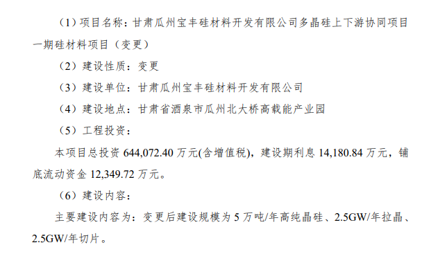 其中,项目一期项目投资644,072.4万元(约64.41亿),建设规模为5万吨/年多晶硅、2.5GW/年拉晶、2.5GW/年切片。