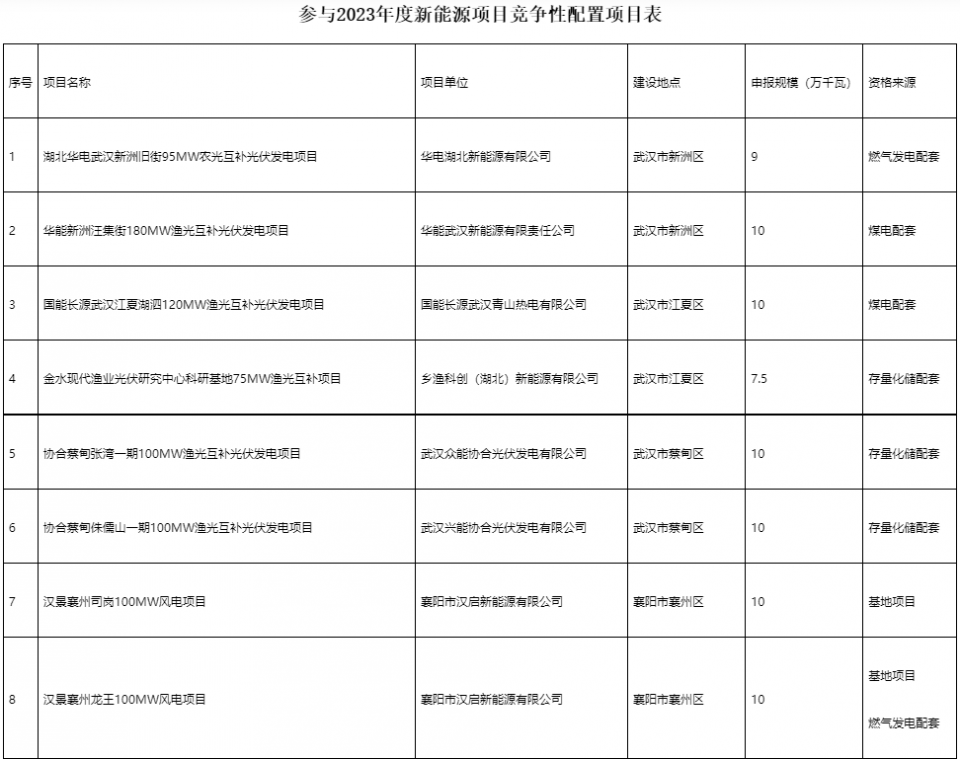 近日,湖北省能源局发布关于参与2023年度新能源竞配项目的公示。