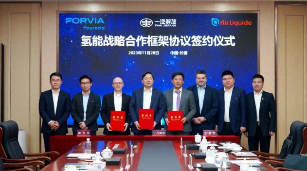 一汽解放汽车有限公司、佛吉亚(上海)氢能投资有限公司以及法国液化空气(中国)投资有限公司于11月28日在吉林长春共同签署了一项关于氢能战略合作的框架协议。此次签署仪式的出席人员包括一汽解放总经理、党委副书记李胜,党委委员、副总经理季一志,佛吉亚氢能投中国区总经理白立松(Alban Brisset),法液空氢能源中国区副总裁陈星等。