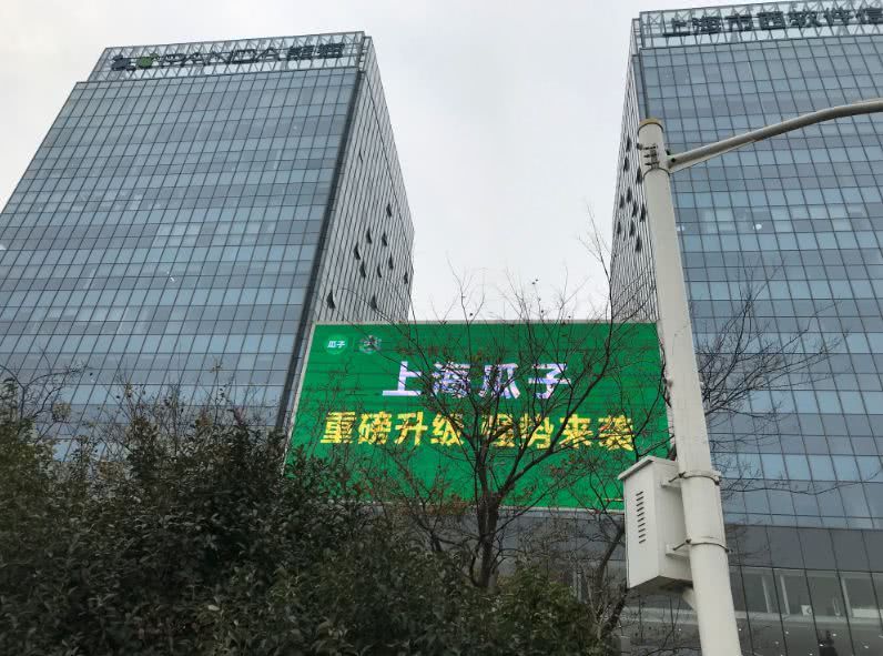 12月17日,《IT时报》记者来到位于嘉松中路5888号的瓜子二手车严选店新址,其所在的办公大楼外立面的电子屏轮播着宣传信息,其中就有插播庆祝瓜子入驻的海报。