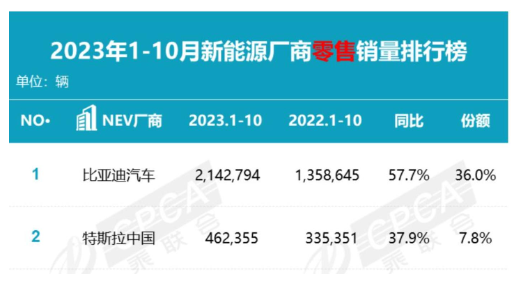 来自改款和众多新品引领的更广范围性价比提升,使得比亚迪收获了比特斯拉更高的增长。乘联会数据显示,2023年1-10月,比亚迪以57.7%的增速,力压37.9%增速的特斯拉。
