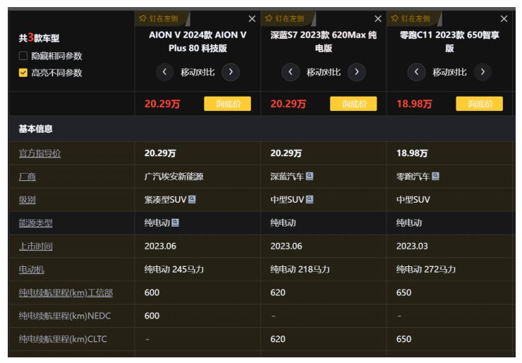 数据显示,零跑主力销售产品从2022年“老头乐”的T03,切换至B级SUV的零跑C11上,3月份还推出了B级轿车(零跑C01)。零跑当下的产品售价区间已调整至15-20万区间。价格调整方面,8月零跑汽车旗下C11、C01部分车型售价进行调整,最高下调2万元。对比同级的零跑C11、AION V、深蓝S7,看以看到,纯电车同级对比下,零跑在续航、汽车空间、智能化配置上与其他产品相近。但便宜1万出头的价格,让零跑C11获得了更高的竞争力。
