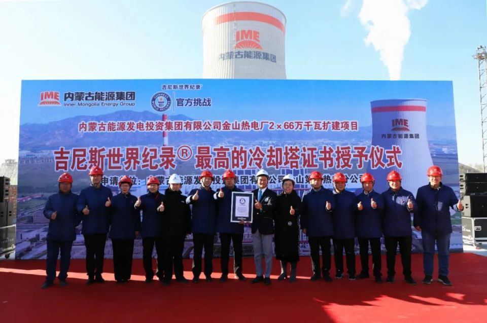 12月1日,吉尼斯世界纪录认证官杨绍鹏现场颁发了“最高的冷却塔”吉尼斯世界纪录证书——内蒙古能源集团金山热电公司间接冷却塔刷新“最高的冷却塔”吉尼斯世界纪录。