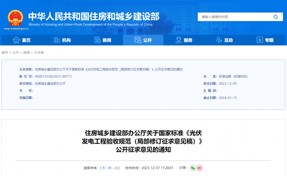 12月8日,住建部发布关于国家标准《光伏发电工程验收规范(局部修订征求意见稿)》公开征求意见的通知。