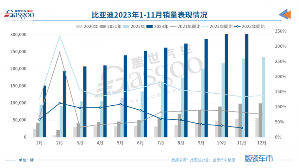 站在月销30万+的高度上,比亚迪依旧在上涨,11月销量达到301,903辆,同比增长31%,同时稍高于10月销量,其中乘用车销售301,378辆,稳居乘用车市场销冠地位。