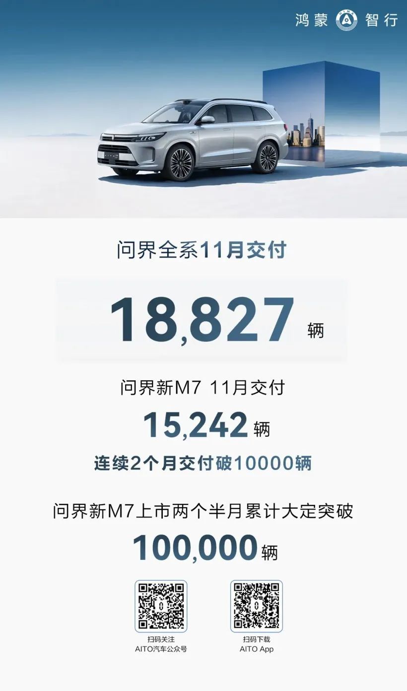 最惊喜表现当属问界。11月,鸿蒙智行旗下的AITO问界系列共交付新车18,827辆。其中,问界新M7交付新车15,242辆,连续两个月交付破1万辆,累计交付超27,000辆。