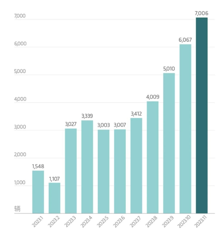 岚图11月交付则首次突破7,000辆,达7,006辆,同比增长高达365%。1-11月累计销量达40535台,较同期增长129%。近5个月,岚图交付量均呈现上升态势,潜能持续迸发。