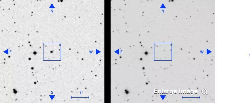 图丨新(右)旧(左)星空观测图比对,标出区域内的恒星已“无故消失”。(来源:Stockholm University/Villarroel et al.)