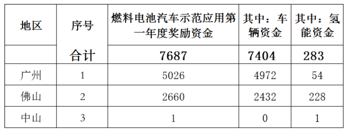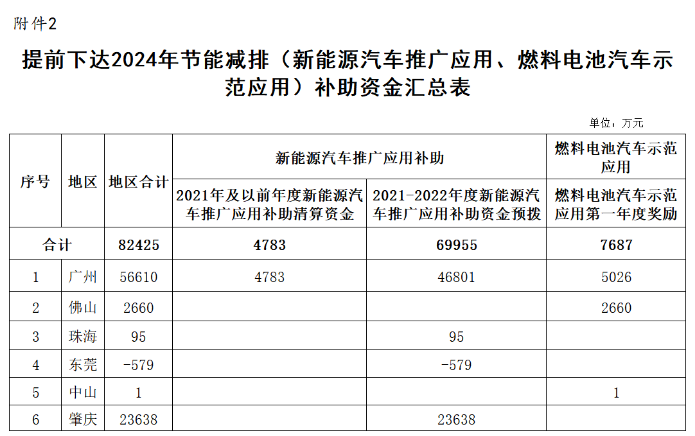 12月7日,广东省财政厅印发提前下达中央2024年节能减排(新能源汽车推广应用、燃料电池汽车示范应用)补助资金预算的通知,文件显示,此次共包含六地市共下达补助总额82425万元,其中燃料电池汽车示范应用第一年度奖励共7687万元,其中车辆资金为7404万元,氢能资金283万元。广州、佛山、中山分别获得5026万元、2660万元和1万元。