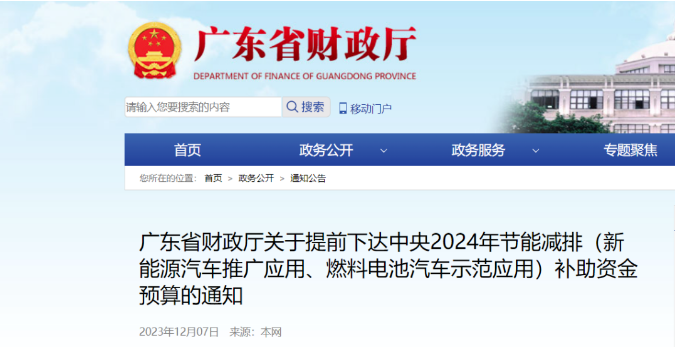 根据《财政部关于提前下达2024年节能减排补助资金预算的通知》(财建〔2023〕336号),经商省发展改革委,现提前下达你市2024年节能减排(新能源汽车推广应用、燃料电池汽车示范应用)补助资金(详见附件1),用于2021年及以前年度新能源汽车推广应用补助清算、2021-2022年度新能源汽车推广应用补助资金预拨以及燃料电池汽车示范应用第一年度奖励。