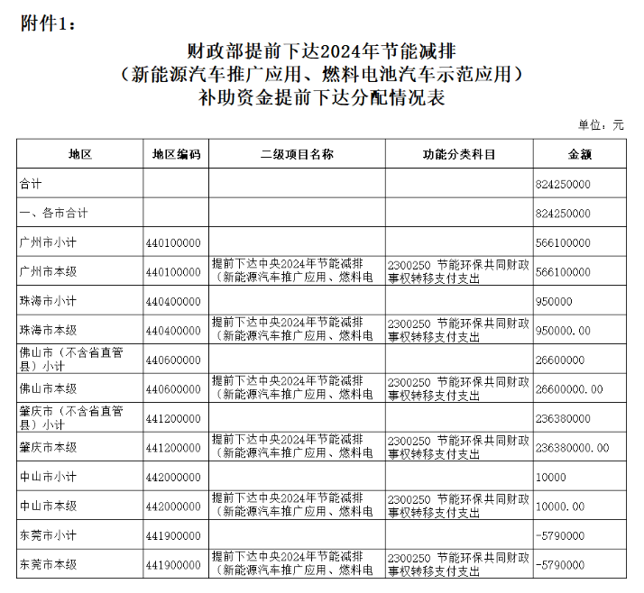 附件:1.财政部提前下达2024年节能减排(新能源汽车推广应用、燃料电池汽车示范应用)补助资金提前下达分配情况表