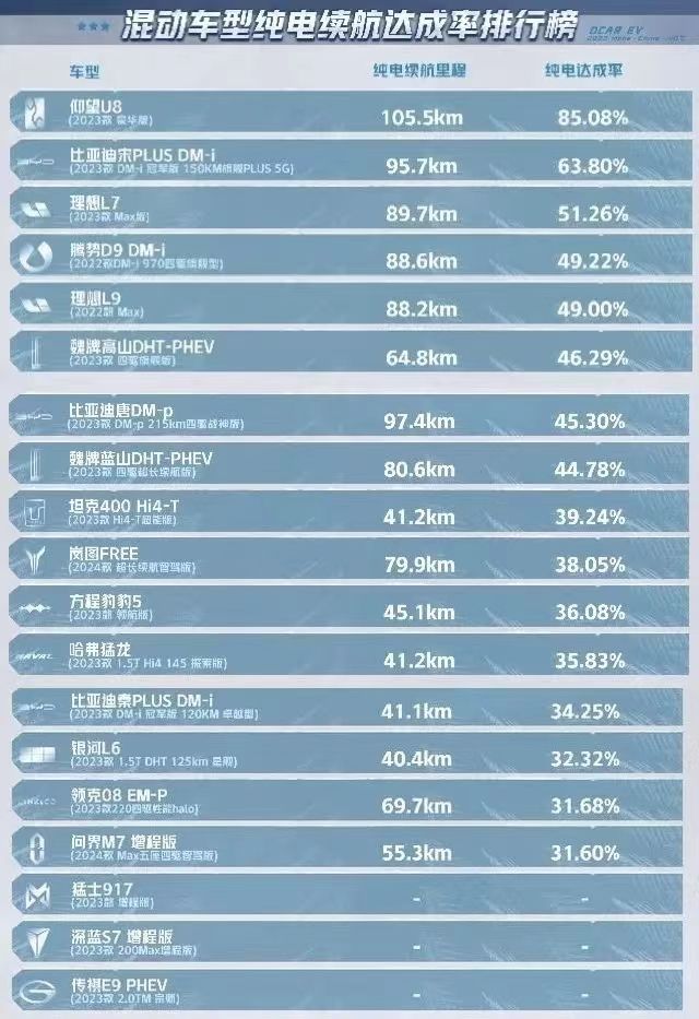 12月,懂车帝举办了一场声势浩大的新能源汽车极限环境冬测,测试了-40℃左右严寒情况下的混动车型纯电续航达成率,其中,比亚迪仰望以85.08%的续航达成率排名第一,华为、赛力斯联合打造的问界M7增程版倒数第一,只有31.6%。