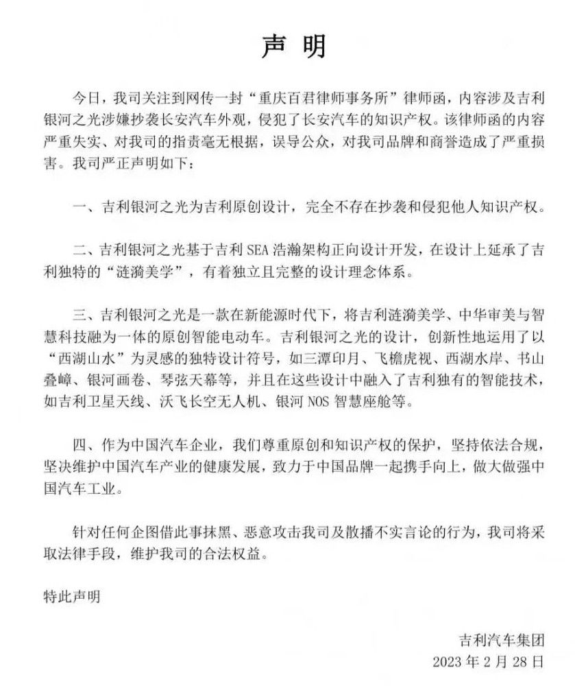 2月28日,网上流传一张长安汽车委托律师事务所发给吉利汽车的律师函,称吉利汽车发布的吉利银河“银河之光”原型车存在大量与长安汽车概念车、量产车型雷同之处,涉嫌侵犯长安汽车知识产权。
