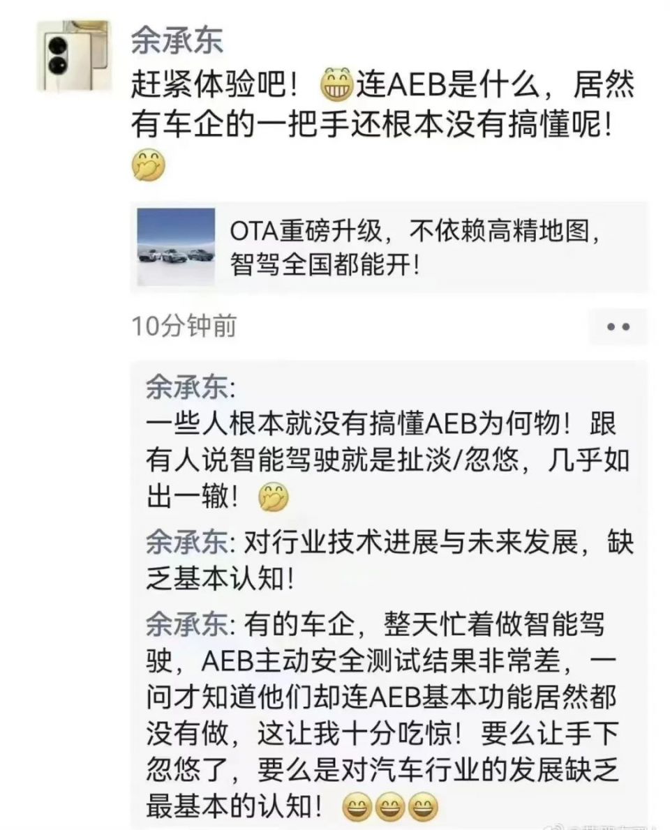 11月3日,余承东在朋友圈针对AEB技术发文:“赶紧体验吧!居然有车企的一把手还根本没有搞懂。”他表示,“一些人根本就没有搞懂AEB为何物!跟有人说智能驾驶就是忽悠,几乎如出一辙!”