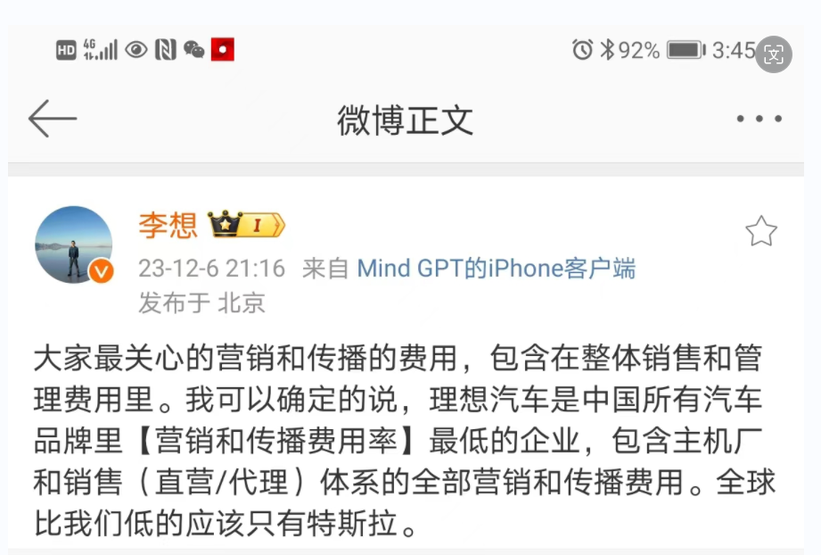 12月7日,理想汽车创始人李想发文表示:“大家最关心的营销和传播的费用,理想汽车是中国所有汽车品牌里‘营销和传播费用率’最低的企业,全球比我们低的应该只有特斯拉。”