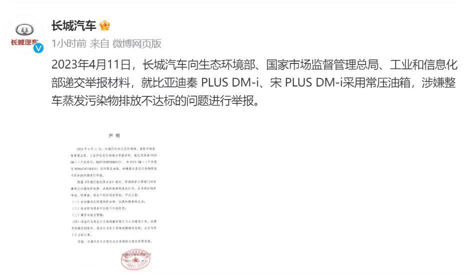 5月25日,长城汽车通过官方微博账号发表声明,就比亚迪秦PLUSDM-i、宋PLUS DM-i采用常压油箱,涉嫌整车蒸发污染物排放不达标的问题进行举报。随后,比亚迪官方回应了长城汽车的举报,认为其检测报告无效,长城不能以此作为依据。