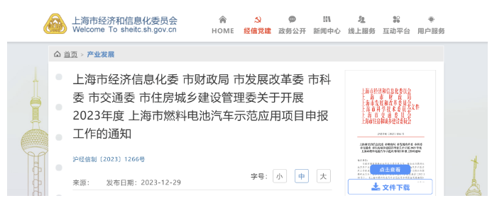 2023年12月29日,上海市经信委、财政局、发改委、科委、交通委、住建委联合发布了关于开展2023年度上海市燃料电池汽车示范应用项目申报工作的通知。