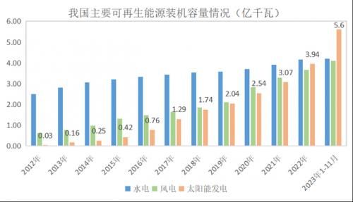 根据国家能源局数据,截至2023年上半年,全国可再生能源装机量突破13亿千瓦,达到13.22亿千瓦,同比增长18.2%,历史性超过煤电,约占我国总装机的48.8%,可再生能源成为我国“第一大电源”。截至11月底,全国累计发电装机容量约28.5亿千瓦,同比增长13.6%。其中,太阳能发电装机容量约5.6亿千瓦,同比增长49.9%;风电装机容量约4.1亿千瓦,同比增长17.6%。