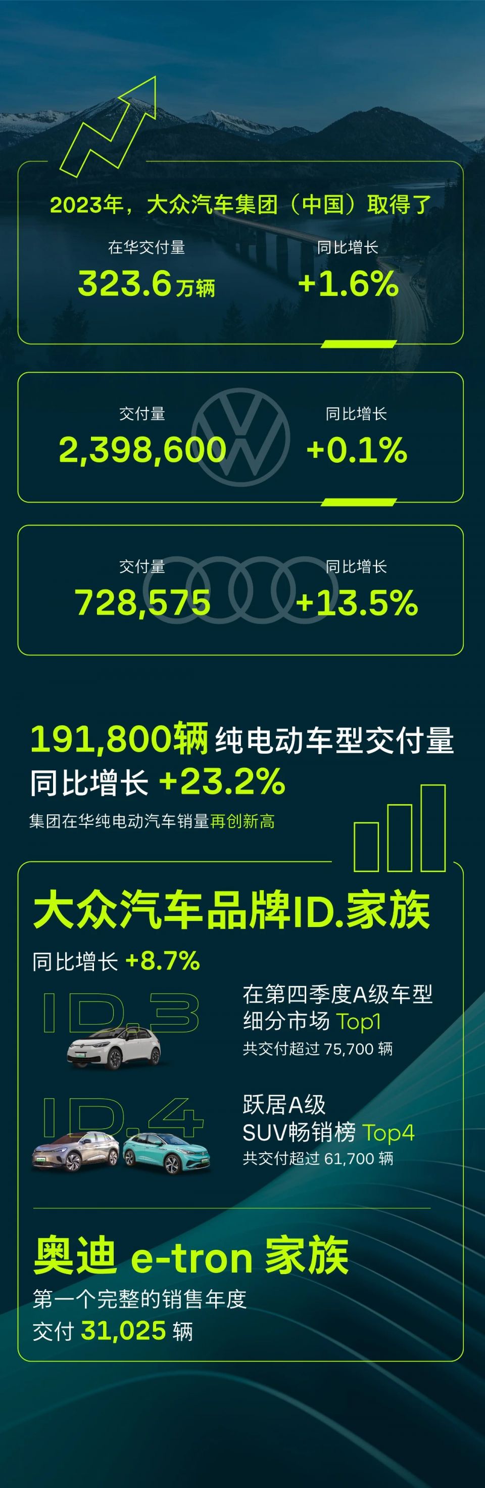 大众汽车品牌及捷达子品牌2023年在华交付车辆2398600台,同比增长0.1%。