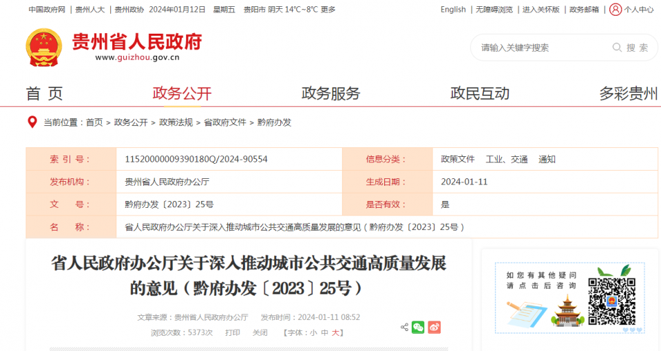 1月11日,贵州省人民政府办公厅发布关于深入推动城市公共交通高质量发展的意见。文件明确,到2025年,贵阳、凯里、遵义、都匀成功创建国家公交都市建设示范城市;城市主城区高峰期公交车平均运行速度不低于20公里/小时;贵阳市新增及更新公交车辆中新能源车占比达到100%,其他城市不低于90%;城市人民政府对城市公共交通企业承担公益性服务等补贴补偿资金到位率100%;城市公共交通乘客满意度达到85%。到2035年,城市公共交通设施更加完备、公交出行更加便捷、服务更加优质、安全更加稳固,基本建成现代化城市公共交通体系。