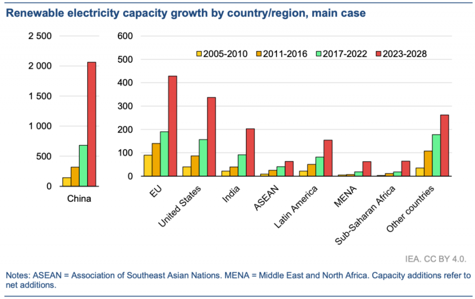 国际能源署最近发布了《2023年可再生能源报告》,预计在2023年至2028年期间,我国将占据全球可再生能源新增产能的56%。在此期间,我国的可再生能源发电容量装机将增加2060吉瓦,超过世界其他地区的1574吉瓦。欧盟和美国分别是全球可再生能源的第二和第三大建设者,预计将分别新增429吉瓦和337吉瓦的产能。然而,值得关注的是,印度预计将增加203吉瓦的可再生能源发电装机容量,东南亚国家联盟的11个国家预计将增加63吉瓦的产能。这表明,亚洲地区已成为可再生能源部署的主力,这主要得益于政策支持力度较大。