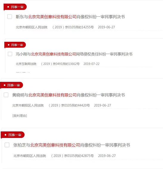 距今最近的一起判决则发生在2019年7月,起诉方为冯小刚,最终法院认定完美创意公司的行为构成侵犯肖像权,判该公司向冯小刚公开赔礼道歉30日以上、及2万余元经济赔偿。
