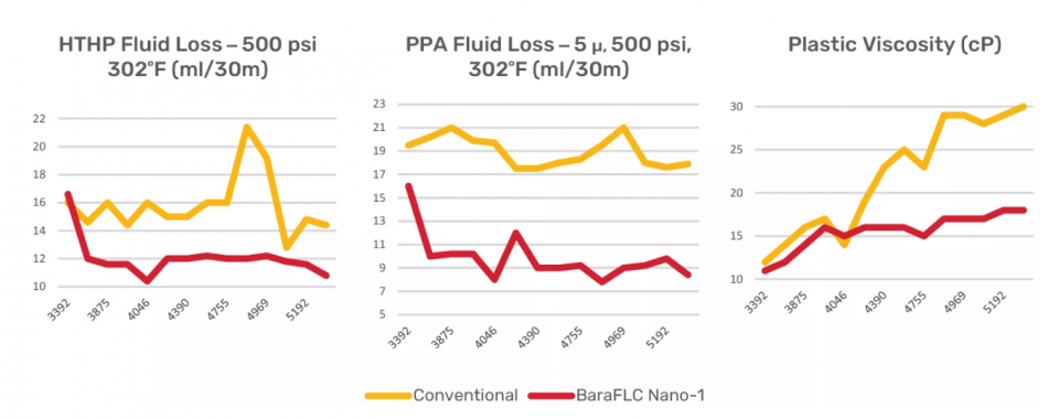 钻出7寸管鞋后,随钻在钻井液中加入BaraFLC Nano-1井筒封堵剂。井筒循环两周后,降滤失性显著改善,高温高压(302华氏度)下的流体漏失量从60毫升降至10毫升,PPA滤失量(302华氏度、500psi压差下10微米样品)从50毫升以上降至11毫升/30分钟。整个井段作业期间,塑性粘度维持在16cP的平均值。