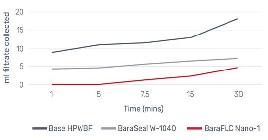 在添加等量产品的情况下,先导试验的瞬时滤失量与总滤失量表明,BaraFLC Nano-1更有效,其瞬时滤失量比基础钻井液少71%,而BaraSeal W-1040比基础钻井液少38%。添加BaraFLC Nano-1也降低了30分钟测试后收集的总滤液量。随着油田开发期间不断添加钻井固体材料,添加BaraFLC Nano-1的钻井液与实验室测试的钻井液相比,滤失量更低。