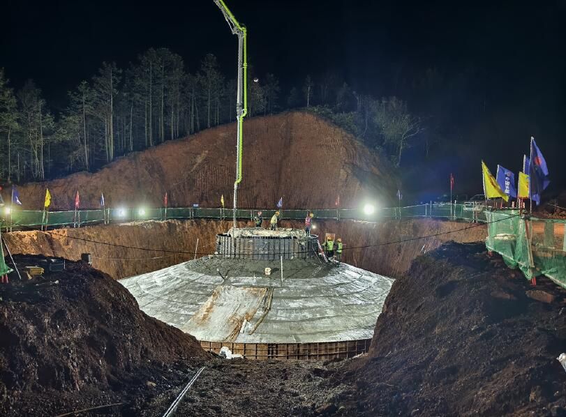 首台风机基础浇筑在风电项目施工中具有里程碑的意义,直接影响后续吊装及发电目标。为确保浇筑工作安全顺利完成,针对四号机位运输道路复杂、天气雨多雾大的实际情况,项目部召开专题部署会,合理安排人员及保障设备,细化任务分工到个人,编制专项措施,有力保障混凝土顺利浇筑。全体施工人员充分发扬铁军精神,克服天气及夜间施工等不利因素,经过18个半小时的昼夜奋战,顺利完成首基浇筑,得到业主和监理的一致肯定。