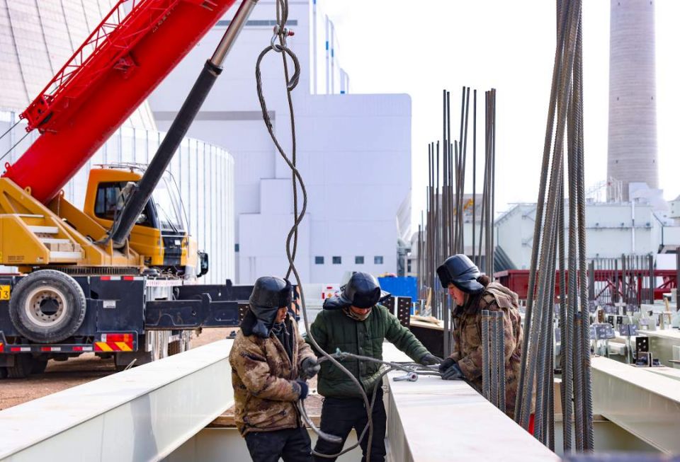 甘肃电投常乐电厂5、6号机组建设现场工作人员开展吊装作业