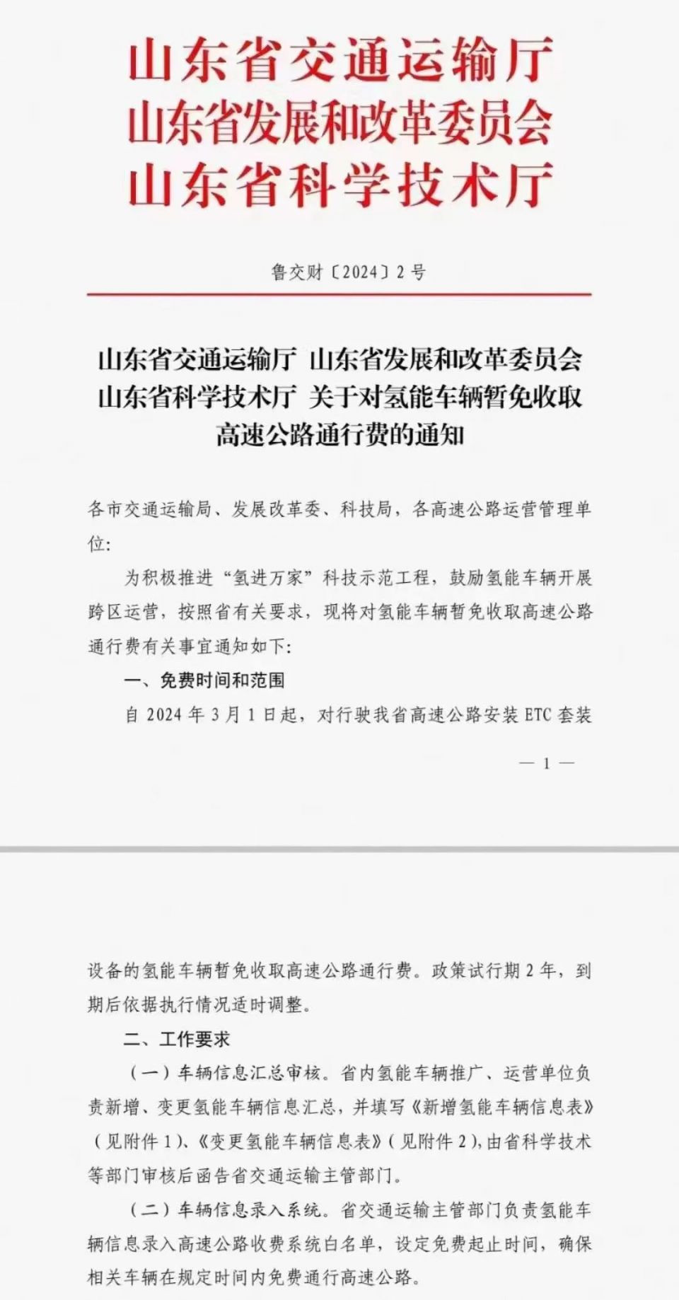 据悉,该通知指出,自2024年3月1日起,对行驶山东省省高速公路安装ETC套装设备的氢能车辆暂免收取高速公路通行费。政策试行期2年,到期后依据执行情况适时调整。