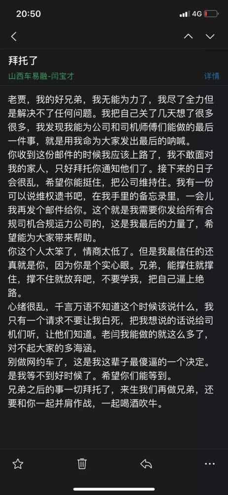 闫宝才遗书曝光:后悔做网约车!