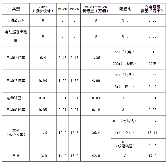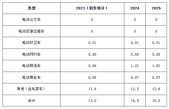 根据工业和信息化部等部门《关于组织开展公共领域车辆全面电动化先行区试点工作的通知》(工信部联通装函〔2023〕23号),试点领域新增及更新车辆中新能源汽车比例显著提高,其中城市公交、出租、环卫、邮政快递、城市物流配送领域力争达到80%。本规划原则上采用以上标准,结合郑州市实际调研情况进行合理调整,2023—2025年各类型新能源汽车增量如下表所示。