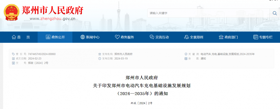 2024年3月19日,郑州市人民政府发布关于印发郑州市电动汽车充电基础设施发展规划(2024—2035年)的通知。