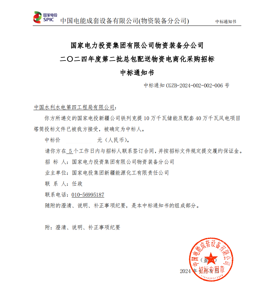 近日,中国水电四局市场开发传来喜讯,成功中标国家电投新疆公司裕民铁列克提10万千瓦储能配置40万千瓦风电项目塔筒采购项目,该项目由新疆分公司执行。